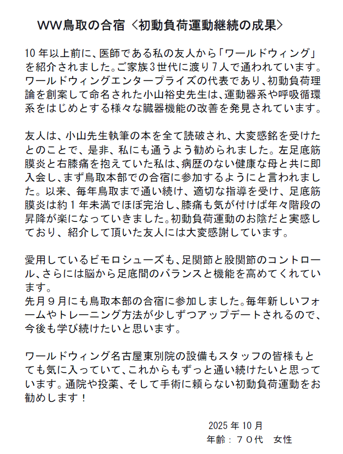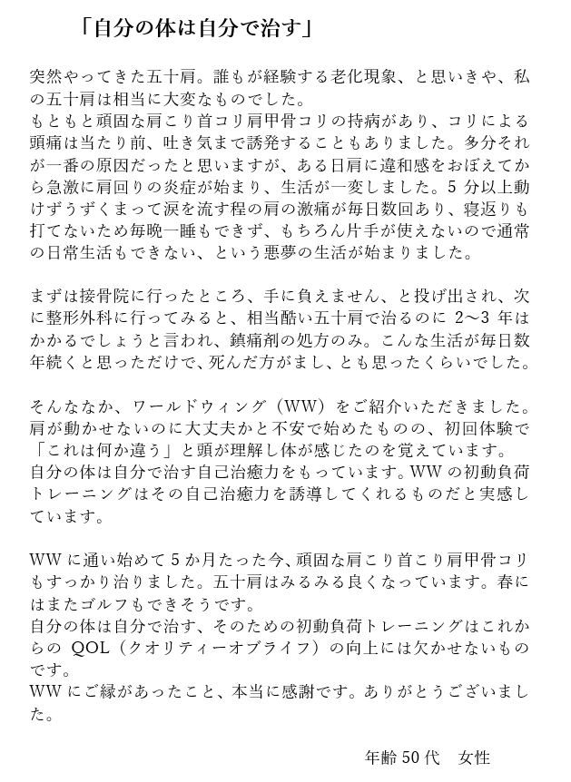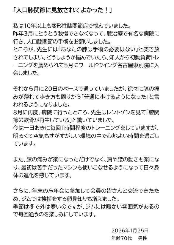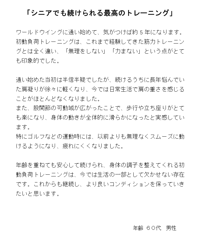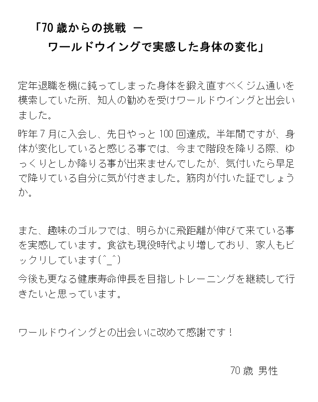 ワールドウィングに通って5年…、体内年齢を若く維持できています!